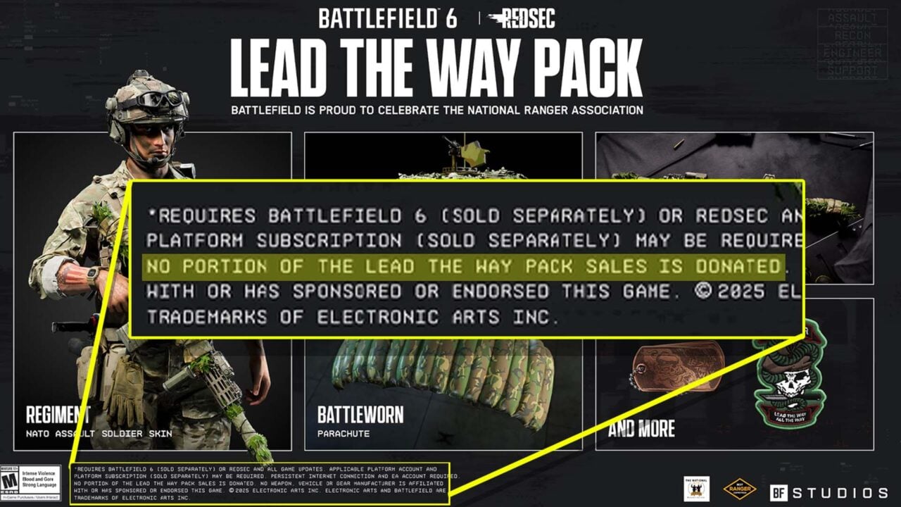 On November 11, EA released the “Lead the Way” cosmetic bundle in its hit multiplayer FPS Battlefield 6. The pack costs $12 and includes gear inspired by Army Rangers, including a new weapon skin, character outfit, and camo parachute. It’s a pretty grounded, realistic cosmetic pack, the kind of thing Battlefield 6 fans love. And if you head over to the Battlefield 6 store online, you’ll see a preview image with text that states: “Join Battlefield in our support of the National Ranger Association.” That seems to imply this is a charity pack, and the store listing’s most prominent text does nothing to indicate otherwise. But if you scroll down far enough, in small text, you’ll find that EA clarifies that the “Lead the Way” pack isn’t directly supporting vets.