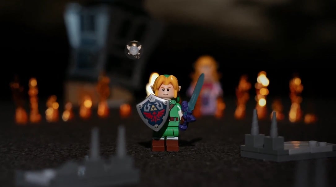 The scene shows Link in his classic green tunic with the Master Sword and Hyrulian shield standing in the ruins of the castle with Princess Zelda in the background. Navi hovers nearby as a shadow creeps up and Ganon’s theme plays, suggesting the Lego set might be a depiction of the final battle from the classic Nintendo 64 game.